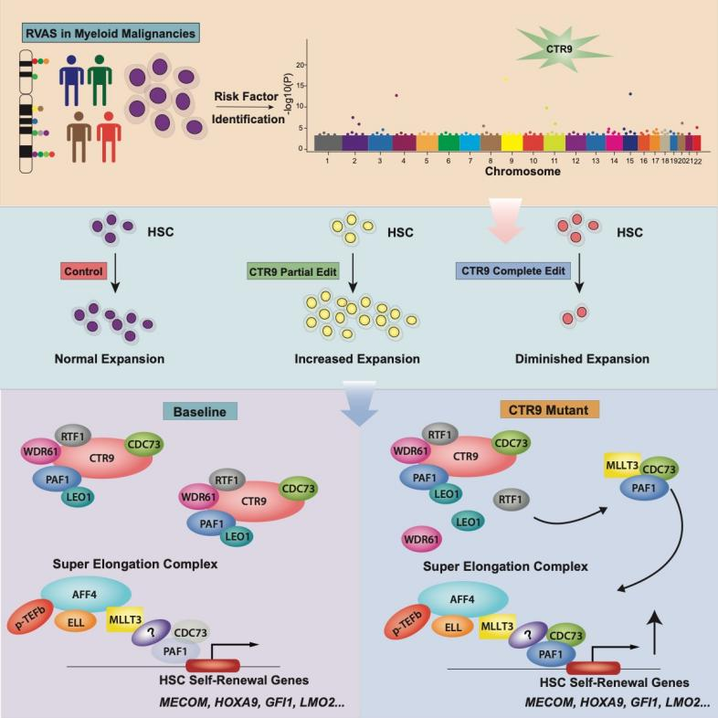 CTR9PAF1蛋白质复合体的重要支架蛋白,在结构上具有粘合PAF1蛋白质复合体其余亚基CDC73,PAF1,LEO1,WDR61的重要作用,而PAF1复合体通常被认为在RNA聚合酶进行转录延展时具有重大作用。在后续的研究中,赵佳伟发现当且仅当CTR9部分缺失时,人长期和短期造血干细胞具有显著性的扩增,且扩增的造血干细胞是具备干细胞功能的。从机制上,当CTR9部分缺失时,一部分PAF1复合体亚基将完全解离成为游离的蛋白质,在这部分游离的蛋白质中,CDC73PAF1可以顺利获得MLLT3加入另一个蛋白质复合体,超级延展复合体(Super Elongation Complex, SEC)。加入了CDC73PAF1SEC可以特异性提升与造血干细胞自我更新相关的转录因子即其他相关蛋白质的mRNA延展效率,从而提高造血干细胞的扩增。