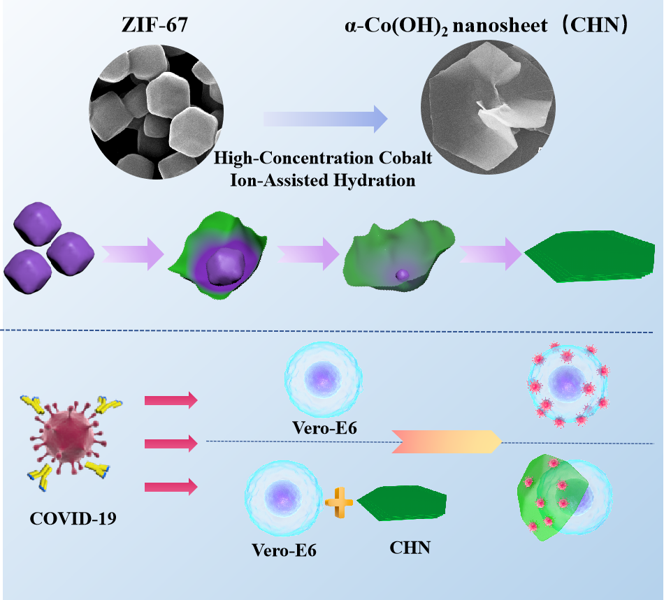 基于上述背景,研究团队开发了一种名为高浓度钴离子辅助水合反应(HCCAH)的新合成策略,利用沸石咪唑框架ZIF-67作为前驱体,成功合成了独立、平整且超薄的 -Co(OH)2 (CHN)纳米片。这些纳米片具有丰富的与新冠病毒Spike蛋白(S蛋白)RBD结合的接触位点,可以有效抑制新冠病毒感染宿主细胞