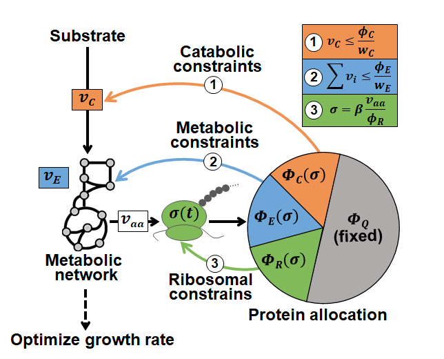 微生物总是生活在不断变化的环境中。为了生存,细菌建立了适应这些变化的能力。其中,代谢通量的重排和蛋白质组的重分配是细菌应对环境变化的常用策略[1-2]。比如,当外部营养条件改变时,细胞会及时调整内部代谢活动以合成氨基酸前体等关键代谢物,进而引起蛋白质组中不同种类蛋白质(例如转运蛋白、核糖体蛋白和代谢酶)合成速率。我们知道,细胞内的化学反应绝大多数属于酶促反应。因此,蛋白质组中各蛋白组分的重分配反过来又会影响代谢网络中通量的分布。然而,现有的工作对细胞代谢通量和蛋白质分配的研究通常是单独召开的。因此,我们对细胞如何顺利获得交叉调控其代谢通量和蛋白质合成以适应不断变化的营养条件这一科学问题还缺乏充分的理解。