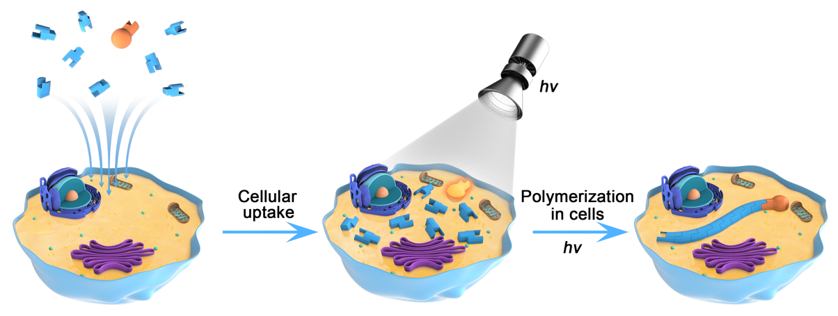 众所周知,由于细胞内化学环境高度复杂且细胞对外部刺激极为敏感,利用化学手段在活细胞内实现分子结构转化,特别是大分子合成不断以来都较为困难。由于相关技术所限,对这些问题的探索现在仅处于起步阶段。设计细胞内原位合成大分子的方法在细胞生物学和医学领域可以给予研究的新方法,具有潜力巨大的可能性
