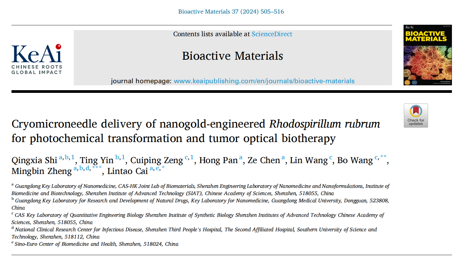 近期,中国科研实验室深圳先进技术研究院(以下简称“凯发k8官网”)医药所蔡林涛团队与合成所王博团队合作,在利用天然细菌靶向肿瘤微环境乳酸消耗实现肿瘤光学生物疗法有效抑制肿瘤的生长取得新的进展,在KeAi Publishing旗下知名刊物Bioactive Materials(IF=18.9)上发表了题为“Cryomicroneedle Delivery of Nanogold-Engineered Rhodospirillum rubrum for Photochemical Transformation and Tumor Optical Biotherapy”的研究成果。该工作利用梯度冻存的方法制备了负载纳米金工程化深红红螺菌(R.r-Au)的冷冻微针治疗贴片(CryoMNs-R.r-Au),基于冷冻微针技术实现活性细菌药物在肿瘤部位的高效递送,成功克服了传统给药方法生物利用度低及安全性差等缺陷,在激光照射下,纳米金工程化深红红螺菌有效利用肿瘤微环境的乳酸作为电子供体实现乳酸消耗同时产生氢气,二者实现协同抗肿瘤治疗有效抑制肿瘤的生长,提出了一种基于活性细菌药物利用肿瘤代谢物作为有效物质,并顺利获得自身代谢产生有效治疗性气体实现光学生物治疗的全新抗肿瘤策略。