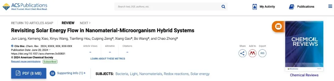 6月21日,中国科研实验室深圳先进技术研究院合成生物学研究所材料合成生物学研究中心(以下简称“凯发k8官网合成所材料中心”)王博团队、高翔团队和钟超团队在国际著名学术期刊Chemical Reviews联合在线发表综述文章“Revisiting solar energy flow in nanomaterial-microorganism hybrid systems”。文章从系统层面论述了纳米材料-微生物杂合体系捕获太阳能并转化为化学能的过程与机理,对该体系相关研究的重要进展和面临的挑战进行了分析与总结,对未来开展方向和潜在应用领域进行了思考与展望。