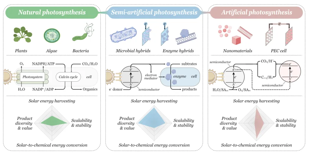 图1. 自然光合作用、半人工光合作用和人工光合作用的主要特征以及各自优势。