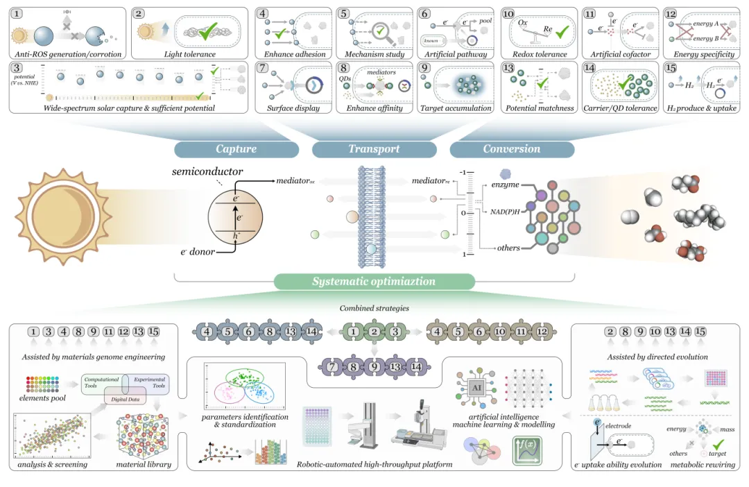 NMHS有潜力成为太阳能驱动生产化学品的清洁平台,这对于有助于能源结构转型和实现人类社会可持续开展至关重要。顺利获得本篇综述,研究团队回顾了该领域最新的研究进展,明确了NMHS后续开展所面临的挑战,提出了系统级别的解决方案和优化策略。以合成生物学技术为代表的现代科技手段可以在提高产品价值、丰富产物多样性和优化微生物生产效率等关键环节赋能NMHS,从而有效有助于系统的持续迭代进化。一套具有实际应用价值的NMHS需要有机整合并充分协调所有有利因素,而高效能量流动的成功实现是NMHS能从实验室迈向工业生产的基石。