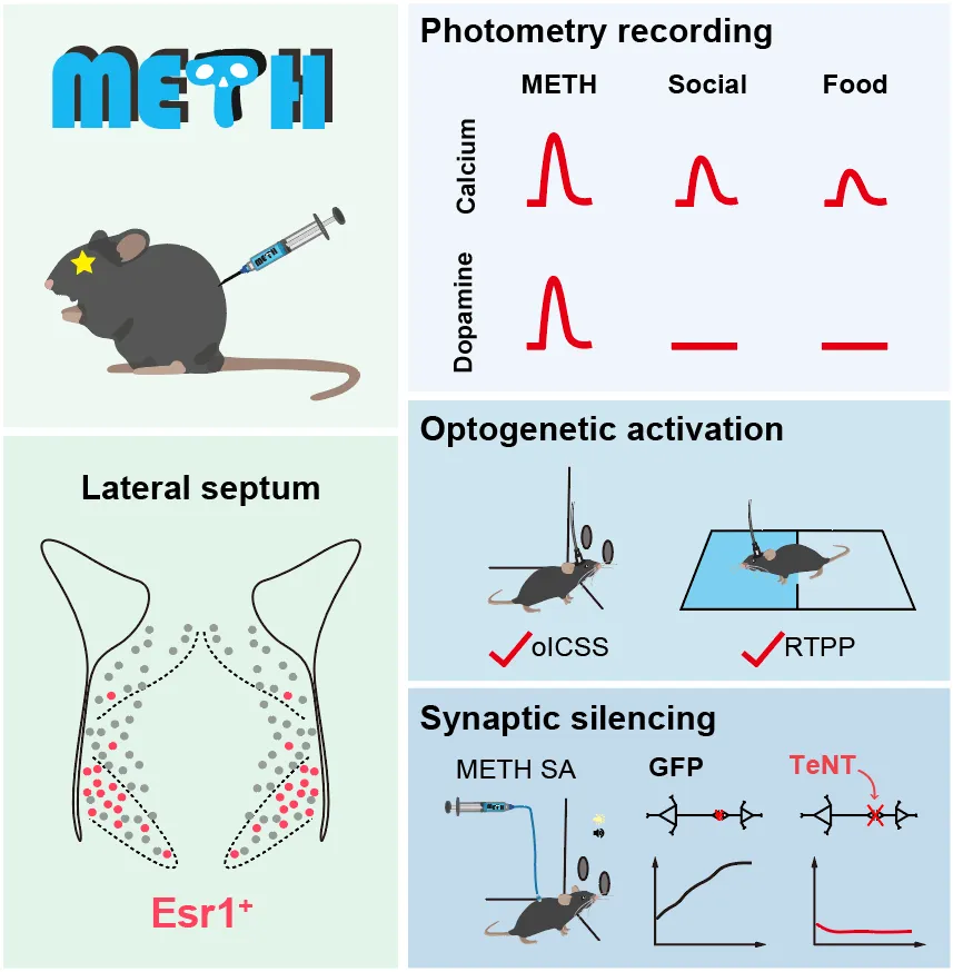 VTA-NAc通路是经典奖赏系统的核心,以往研究表明,自然奖赏(如美食和社交)和毒品(甲基苯丙胺等)都可以增加NAc脑区的多巴胺水平。有意思的是,研究团队发现LS也接收VTA多巴胺神经元投射,并且LS的多巴胺释放只有在毒品(甲基苯丙胺、阿片等)刺激后才会增加,提示LS的多巴胺释放更能代表毒品奖赏的特征。与之对应的是,失活LSEsr1神经元可以消除甲基苯丙胺的奖赏效应,而不影响美食和社交奖赏,从而为特异地干预毒品成瘾给予了新的环路和细胞靶点。
