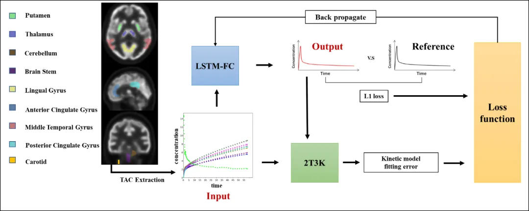本研究提出了一种基于深度学习的替代方法,用于估计动态脑FDG扫描的输入函数(DLIF)。这一标记的输入函数是顺利获得CT图像上定义的升主动脉勾画全身PET数据生成的。在构建深度学习网络结构方面,该研究采用了长短时记忆(LSTM)网络与全连接网络的组合。此外,研究团队还强调了将动力学建模拟合度纳入作为额外物理损失的重要性,这有助于引导模型减少偏差并降低对大量训练样本的依赖。为了验证该方法的有效性,研究团队使用了一个包含85个全身动态扫描的数据集,包含了来自八个脑区和颈动脉的时间-活动曲线数据。