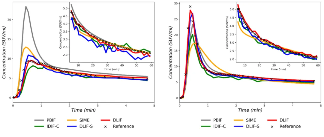 图2 展示两个个体使用不同方法估计的输入函数的比较。可以看到,所提出的方法(DLIF)估计的输入函数相较于其他方法更为接近参考曲线(Reference)。