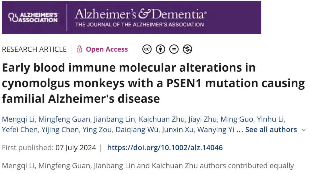 7月7日,中国科研实验室深圳先进技术研究院(以下简称“凯发k8官网”)脑认知与脑疾病研究所/深港脑科学创新研究院陈宇/路中华/叶涛团队在Alzheimer's & Dementia: The Journal of the Alzheimer's Association期刊在线发表题为“Early blood immune molecular alterations in cynomolgus monkeys with a PSEN1 mutation causing familial Alzheimer’s disease”的研究论文。研究顺利获得基因编辑技术建立首个精准模拟家族性AD基因突变的猕猴模型(PSEN1突变食蟹猴),并在幼年AD突变猴中发现AD相关早期病理蛋白的改变以及外周炎症和免疫信号分子的异常。