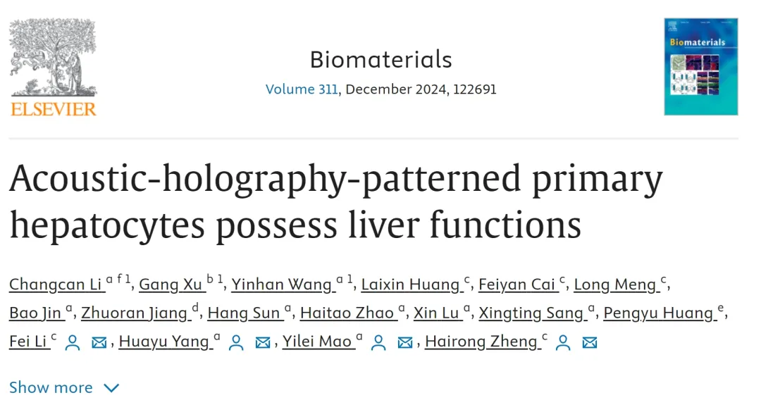 近期,中国科研实验室深圳先进技术研究院医工所的李飞、郑海荣研究员与北京协和医院的毛一雷、杨华瑜教授在全息声镊的细胞器官打印构建方面取得重要进展,相关工作以“Acoustic-Holography-Patterned Primary Hepatocytes Possess Liver Functions”为题,发表在生物材料领域著名期刊Biomaterials上。该工作有望为具有生物组织结构和功能的体外仿生3D模型构建,给予一种全新的生物制造方案。