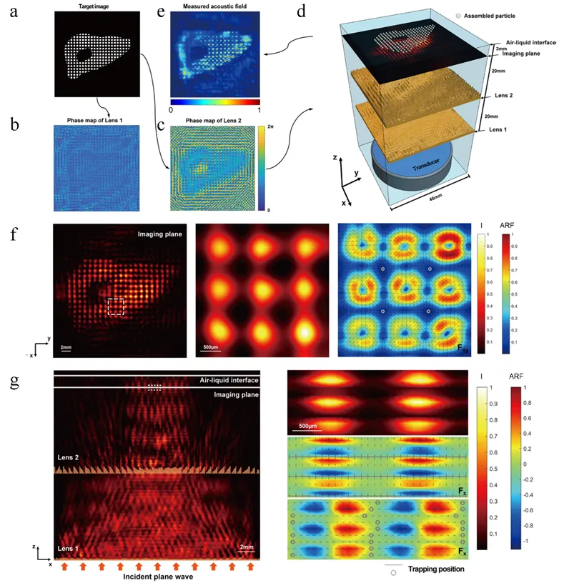 针对上述局限性,研究者第一时间改进了现有的全息声镊技术,提出了“全息晶格声镊”(Holographic lattice-based acoustic tweezers),开发了声全息透镜组对入射声波的相位和幅度同时进行调制,以生成任意复杂图案的声全息晶格阵列,如圆形、三角形、正方形和肝形状的复杂声全息晶格图案,并进一步利用声势阱产生的声辐射力效应将细胞组装成特异性点阵图案,模拟肝脏解剖结构。