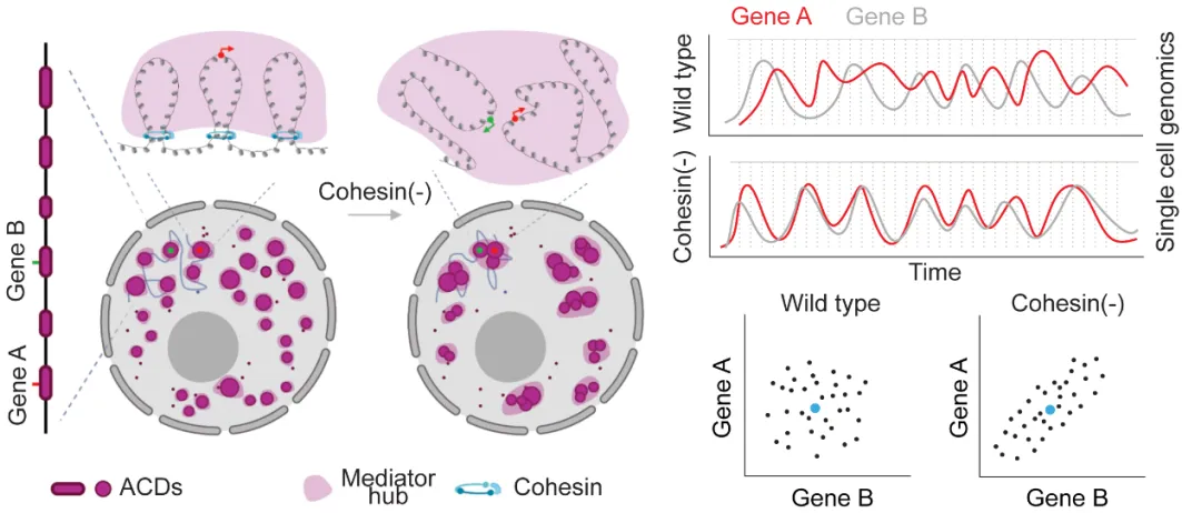 该研究顺利获得结合单细胞RNA测序和单细胞染色质可及性测序(ATAC-seq),发现Cohesin复合体的缺失,除了会显著影响基因组的折叠,还会促进不同开放染色质结构域之内基因的共表达(Co-activation)和染色质结构域之间的协同开放(Chromatin co-accessibility)。基于此结果,研究者提出了“基因组三维结构参与基因转录共调控”的科学假设。该研究进一步利用基于内含子顺序杂交(Intron seq-FISH)的空间基因组学方法、单分子定位超高分辨率成像和活细胞单分子示踪等技术,在全基因组和染色体水平上验证了上述科学假设。