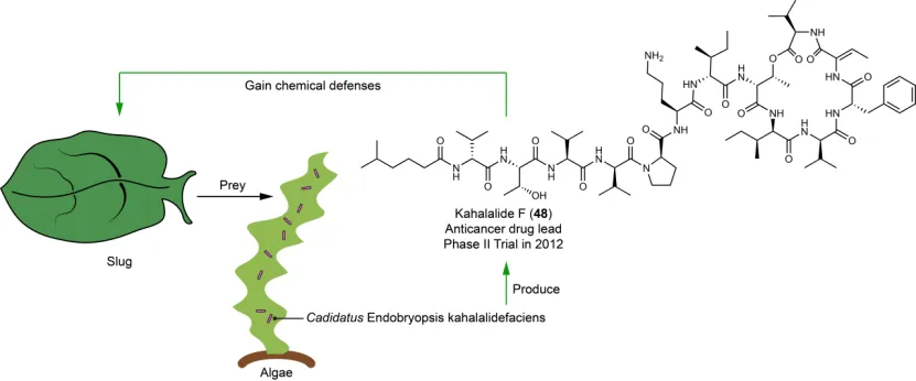 此外,细菌与蜜蜂、甲虫、蚊子、海绵、船蛆的互作也展现了细菌在应对致命病原威胁中的重要防御机制。研究还发现了一种有趣的细菌-藻类-海蛞蝓的三方互作现象:海蛞蝓顺利获得啃咬藻类,摄取具有抗癌作用的防御性非核糖体肽类物质,以抵御自身天敌。