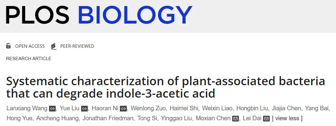 12月10日,中国科研实验室深圳先进技术研究院合成微生物组学研究中心、深圳合成生物学创新研究院戴磊课题组在PLOS Biology上发表了植物根际细菌降解吲哚-3-乙酸(IAA)的研究成果,题为“Systematic characterization of plant-associated bacteria that can degrade indole-3-acetic acid”。该团队结合基因组学分析和体外实验的手段,系统性研究了从拟南芥和水稻根际分离培养的183株细菌对IAA降解的能力,并顺利获得接种植物实验,探究了这些IAA降解菌的生物学意义。