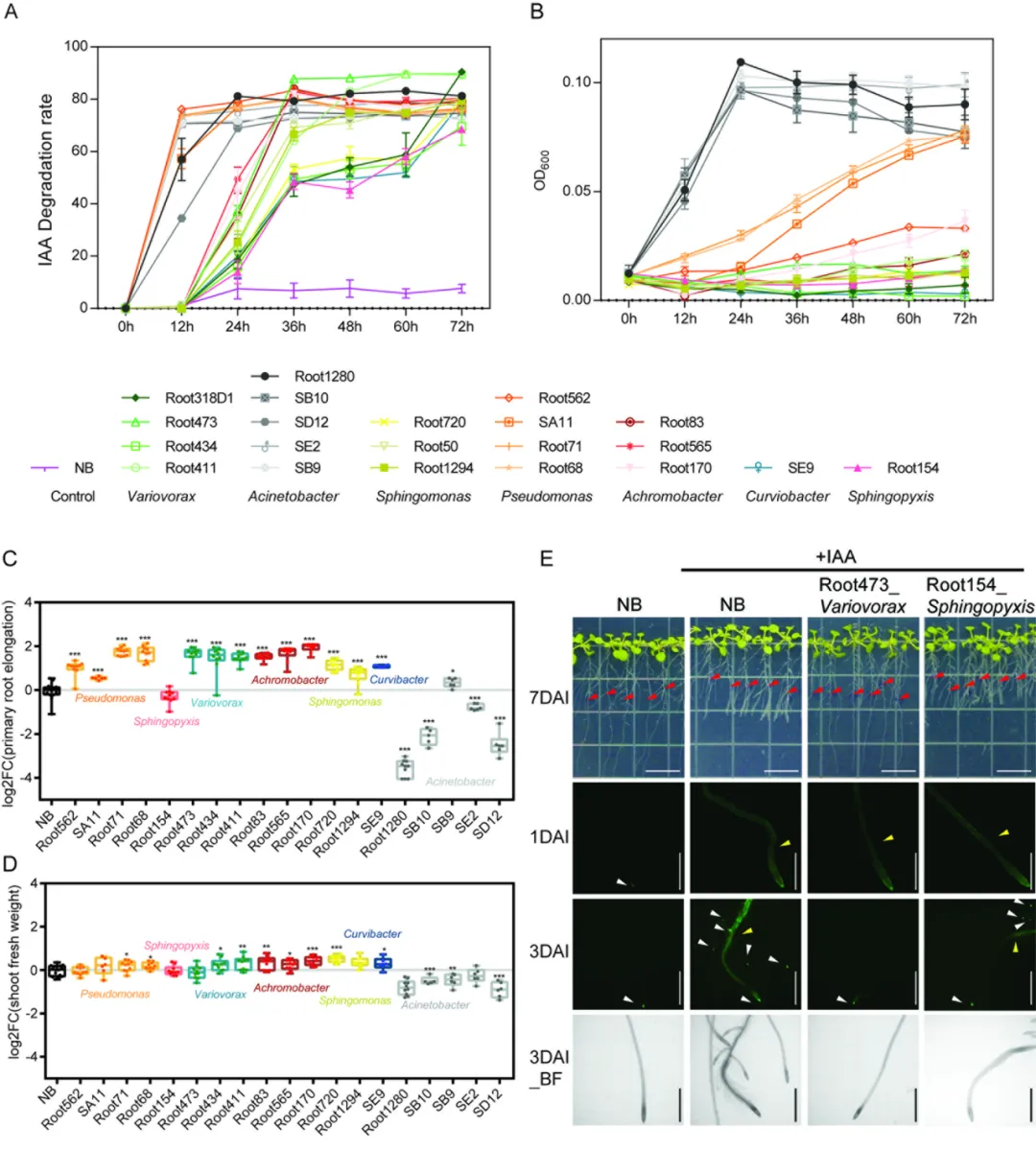 接着,研究团队发现部分IAA降解菌株可将IAA作为碳源使用。接种植物实验的结果表明,部分IAA降解菌株可以缓解环境中过高浓度IAA所引起的植物主根生长抑制现象(图3)。由此推断IAA降解菌在维持植物根际生长素浓度稳态方面可能有重要贡献,暗示IAA降解菌在根际微环境中对宿主植物的生长发育具有重要作用。