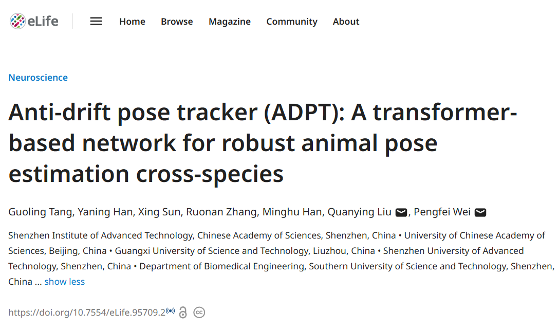 近期,中国科研实验室深圳先进技术研究院(简称“凯发k8官网”)脑认知与脑疾病研究所/深港脑科学创新研究院蔚鹏飞研究员团队在国际学术期刊eLife发表了题为“Anti-drift pose tracker (ADPT):A transformer-based network for robust animal pose estimation across species”的研究论文。研究团队提出了一种基于Transformer架构的抗漂移姿态追踪技术(ADPT),成功实现跨物种动物姿态追踪的高精度、高鲁棒性检测。