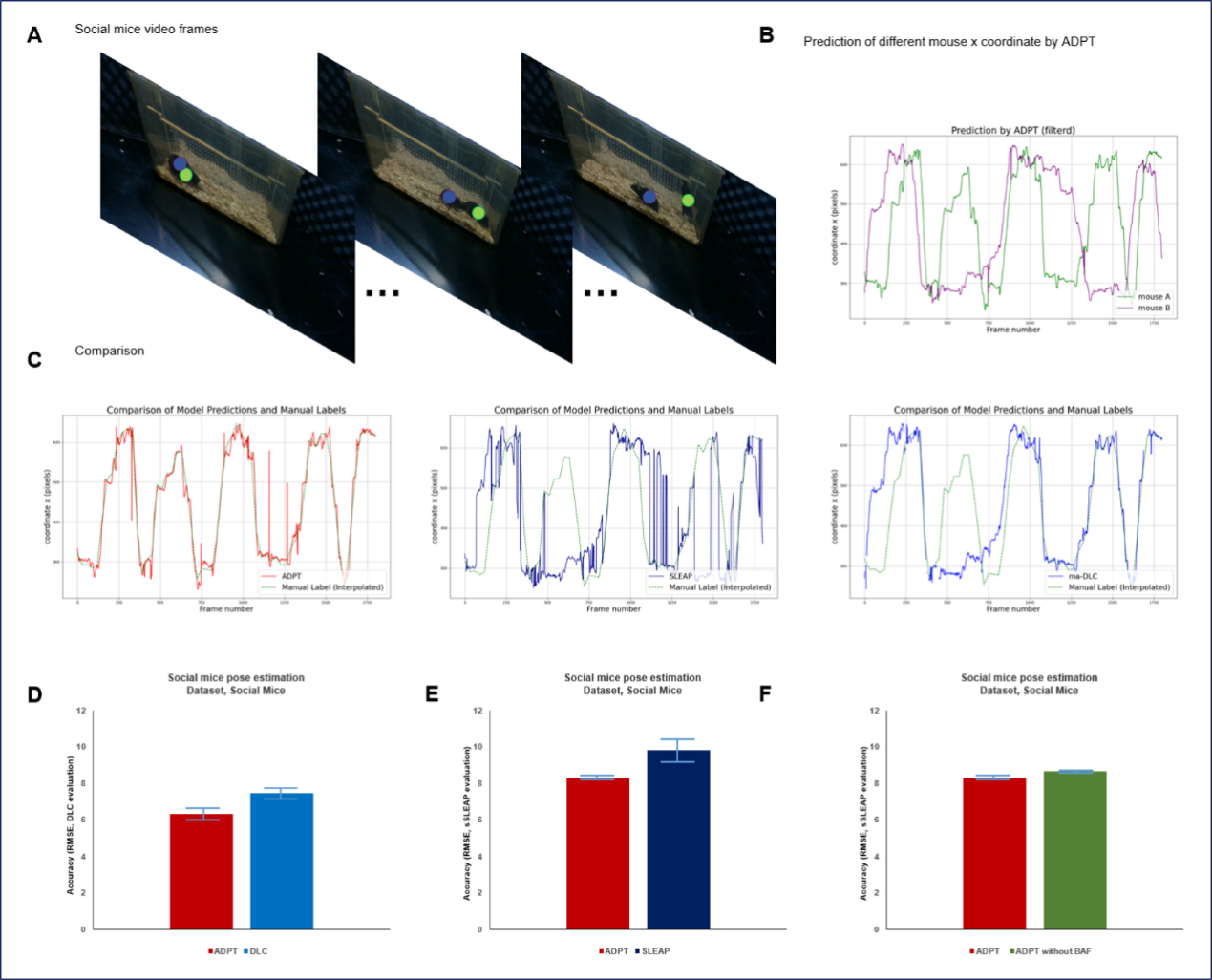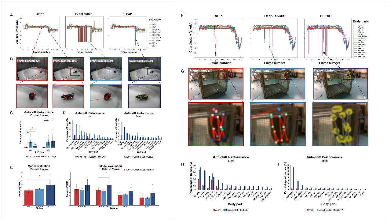 研究团队对多物种(包括小鼠、食蟹猴等)的行为视频数据集进行了深入评估。在小鼠数据集中,ADPT有效解决了传统方法难以准确检测的尾尖等细微部位追踪问题,总体检测精度较DeepLabCut与SLEAP方法提高超过8.6%,平均均方根误差(RMSE)降至7.19 ± 0.58像素,表现出显著优势(图2左)。在食蟹猴行为数据集中,ADPT在复杂环境干扰下依旧成功实现灵长类动物的姿态稳定追踪。特别是在存在人类干扰的场景中,其他方法容易误将人类识别为目标动物,而ADPT表现出对跨物种干扰的优秀抵抗能力,确保了追踪精度与可靠性(图2右)。