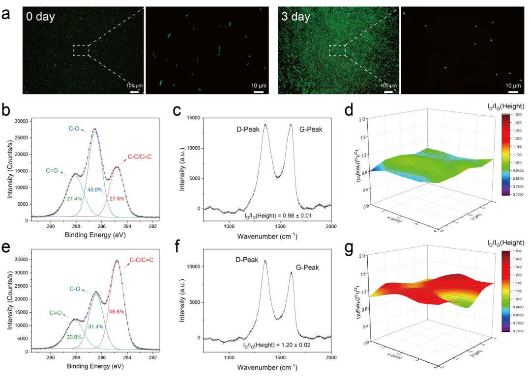 活/死检测结果展示,细菌在水凝胶中仍然可以保持活性,并可将氧化石墨烯(GO)还原为还原氧化石墨烯(rGO)(图3)。具体来看,C1s XPS光谱显示,与GO对照样品相比,MR-1 rGO样品中C-C/C=C键的百分比显著增加(从27.6%增加到48.6%),而C-O/C=O键的百分比相应减少(从72.4%减少到51.5%),这表明含氧C键显著减少。拉曼光谱中D峰和G峰的强度比(ID/IG)与sp2共轭区域成反比,该比值从0.98增加到1.2,为GO的成功还原给予了有力证据;并且,强度比(ID/IG)在约3天时达到平台期,这意味着水凝胶中的GO已完全还原。此外,水凝胶中的GO对S. oneidensis MR-1的生长没有显著影响,在浓度范围为0.5 mg/mL至5 mg/mL的GO条件下,均未观察到抑菌圈的形成。在整个培养过程中,细菌的存活率保持在80%以上,充分表明其代谢活性得以保存。拉曼成像图案显示出GO还原在水凝胶中的均一性。