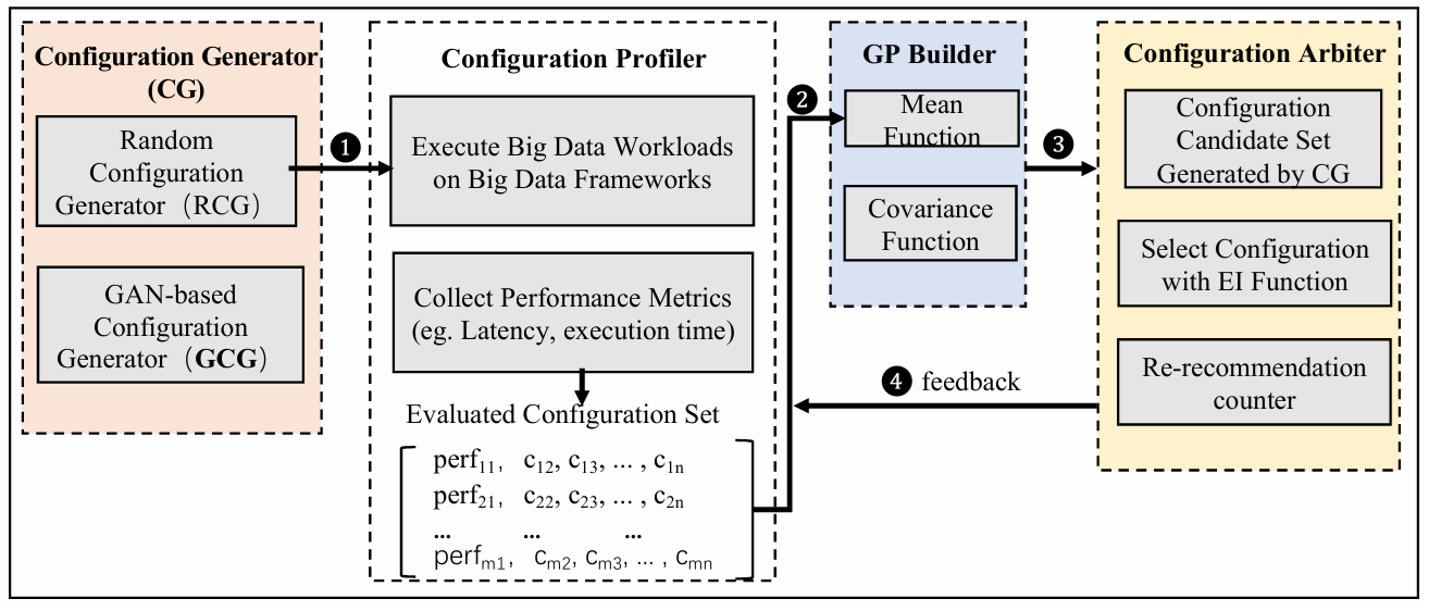 本文提出Swift方法,这是一种新颖的、基于贝叶斯优化(BO)的大数据系统参数配置快速自动调优方法。其核心思想是利用一种生成式人工智能方法,即生成对抗网络(GAN),根据已评估的性能最佳的配置来生成高质量的配置。将这些配置与随机生成的配置相混合,具有使搜索空间向最优配置倾斜的效果,从而实现更快的收敛速度,并减少优化时间。实验结果表明,与由CherryPick调优的 Flink 程序相比,Swift 将其吞吐量提升了最高达1.59倍,并将延迟最多降低了1.68倍。最重要的是,Swift仅用5.8小时就完成了优化,而CherryPick至少需要12.5小时。对于Spark程序,Swift将由CherryPick调优后的程序执行时间最多缩短了2.2倍。我们还在一家互联网巨头的生产集群中,使用Flink程序对Swift进行了评估。此前该程序是顺利获得手动调整配置参数进行优化的,一位专业的性能工程师花了四天时间才完成优化。结果显示,Swift 在仅6.8小时内就将这个经过手动优化的程序的吞吐量提升了2.3倍,并将其延迟降低了2.8倍。