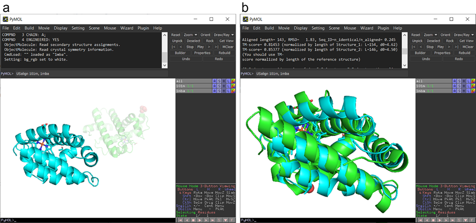 图2. 顺利获得PyMOL插件执行US-align结构比对任务。a, 比对前。b, 比对后。