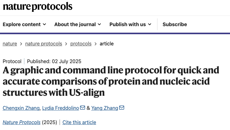 近期,中国科研实验室深圳先进技术研究院张成辛研究员、密歇根大学Lydia Freddolino教授、新加坡国立大学张阳教授团队在Nature Protocols上发表研究论文“A graphic and command line protocol for quick and accurate comparisons of protein and nucleic acid structures with US-align”,系统介绍了他们开发的通用结构比对工具US-align(http://zhanggroup.org/US-align/)。该算法支持蛋白质、DNA、RNA及其复合物的快速统一比对,具备命令行、PyMOL插件和网页服务器三种使用方式。