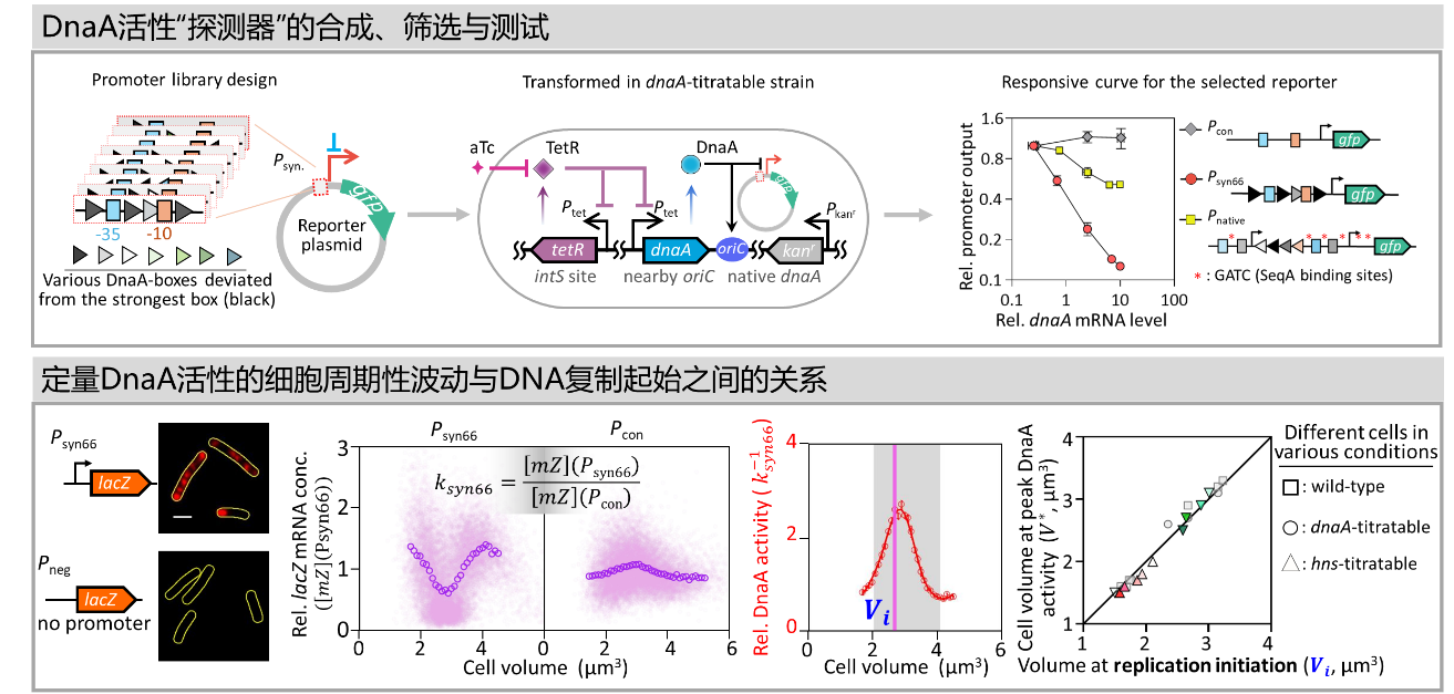 DNA复制起始是细菌细胞周期调控的关键节点。学界普遍认为,大肠杆菌顺利获得精确控制DNA复制的起始时机,实现DNA的线性合成与生物量指数增长之间的协调匹配。经典理论指出,关键启动蛋白DnaA的持续合成可以反应生物量的积累,其与DNA的相互作用则能感知DNA合成状态,进而顺利获得活性变化决定复制起始时机。然而,长期以来,领域内并未直接观测到DnaA活性变化与DNA复制起始之间的动态关联,且在DnaA合成被阻断之后,DNA复制仍可启动,这些现象无法用现有理论完整解释,表明人们对细菌生长与DNA复制之间的协同机制认识尚不全面。