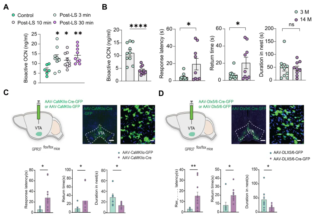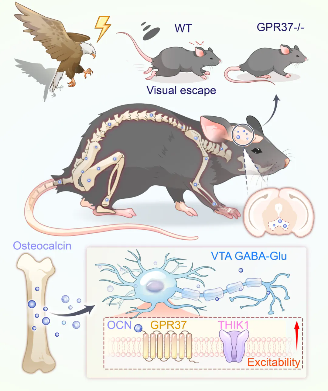 综上,本研究揭示了骨骼激素OCN在危急时刻启动本能逃跑反应的完整通路:OCN → 结合VTA GABA-Glu共释放的神经元上的GPR37 →降低cAMP→抑制THIK1钾通道→ 增强神经元兴奋性→ 触发快速逃跑行为。