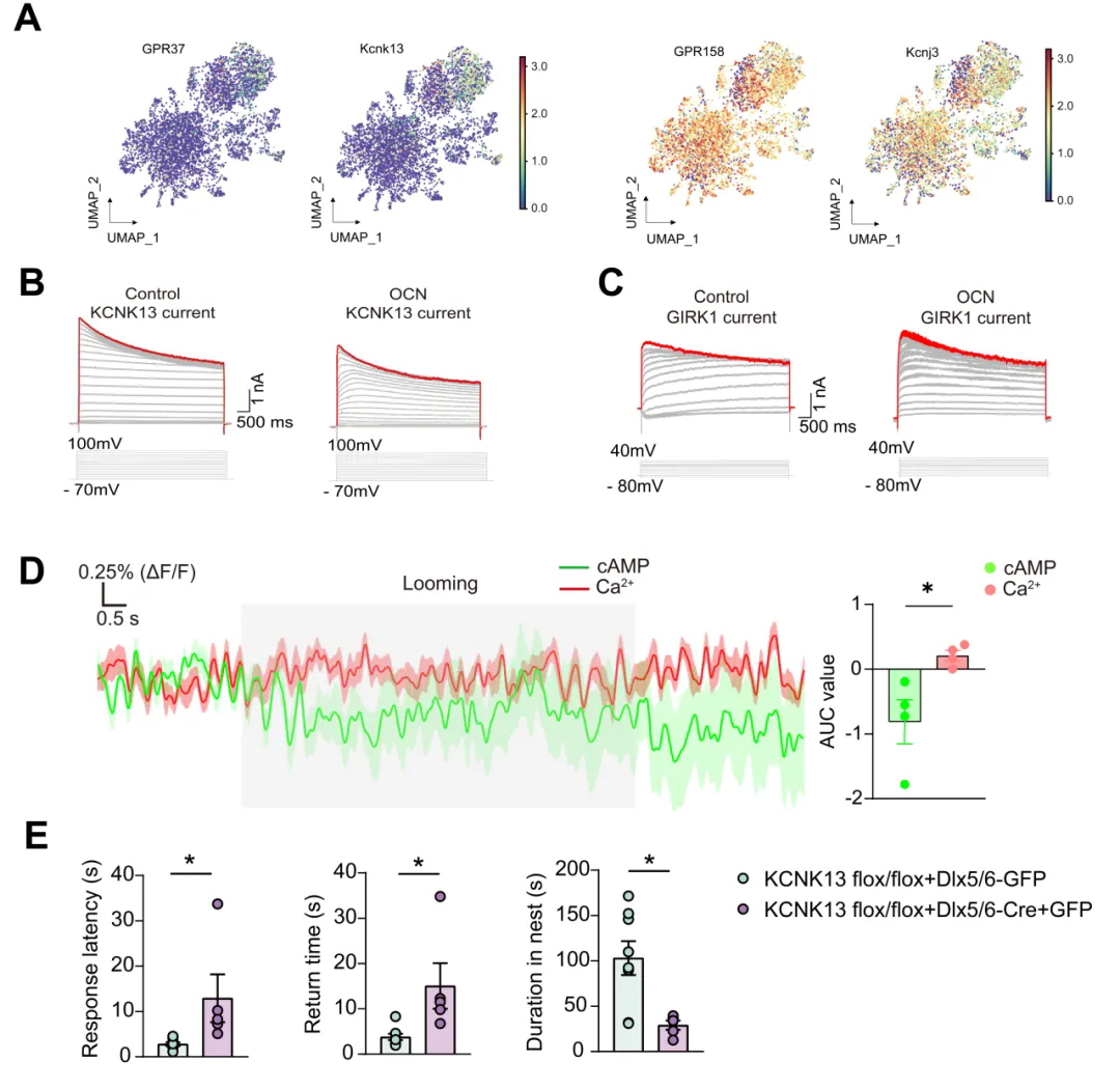 研究发现,Looming反应可显著提升血液OCN水平;老年鼠OCN下调伴随应激反应敏感性降低,OCN敲除小鼠得到类似结果,证实OCN参与该反应。VTA脑区补充OCN实验表明VTA是OCN发挥作用的关键脑区(图1)。在OCN受体研究中,顺利获得敲除模型证明GPR37介导逃跑反应,且VTA的GABA能与谷氨酸能神经元上的GPR37起主要作用(图1)。电生理实验显示OCN顺利获得调控VTA神经元钾电流影响神经元活性。单细胞测序与机器学习分析表明GPR37与钾通道THIK1、GPR158与GIRK1分别相关;π-FISH技术进一步证实GPR37与THIK1共表达于Type I神经元,GPR158与GIRK1共表达于Type II神经元(图2)。功能上,OCN顺利获得GPR37抑制THIK1电流增强兴奋性,顺利获得GPR158增强GIRK1电流导致抑制。机制上,GPR37顺利获得非经典Gi通路降低cAMP、抑制THIK1通道,从而提升神经元兴奋性。行为学实验验证,VTA区阻断cAMP或特异性敲除THIK1通道均会削弱逃跑反应(图2)。