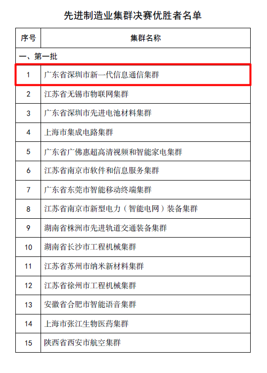 为有助于先进制造业集群开展,落实国家培育世界级先进制造业集群的重大战略部署,工信部以集群竞赛的方式,围绕新一代信息技术、高端装备、新材料、生物医药等重点领域,遴选25个先进制造业集群作为重点培育对象,其中深圳市新一代信息通信产业集群是工信部最早试点的三个集群之一。