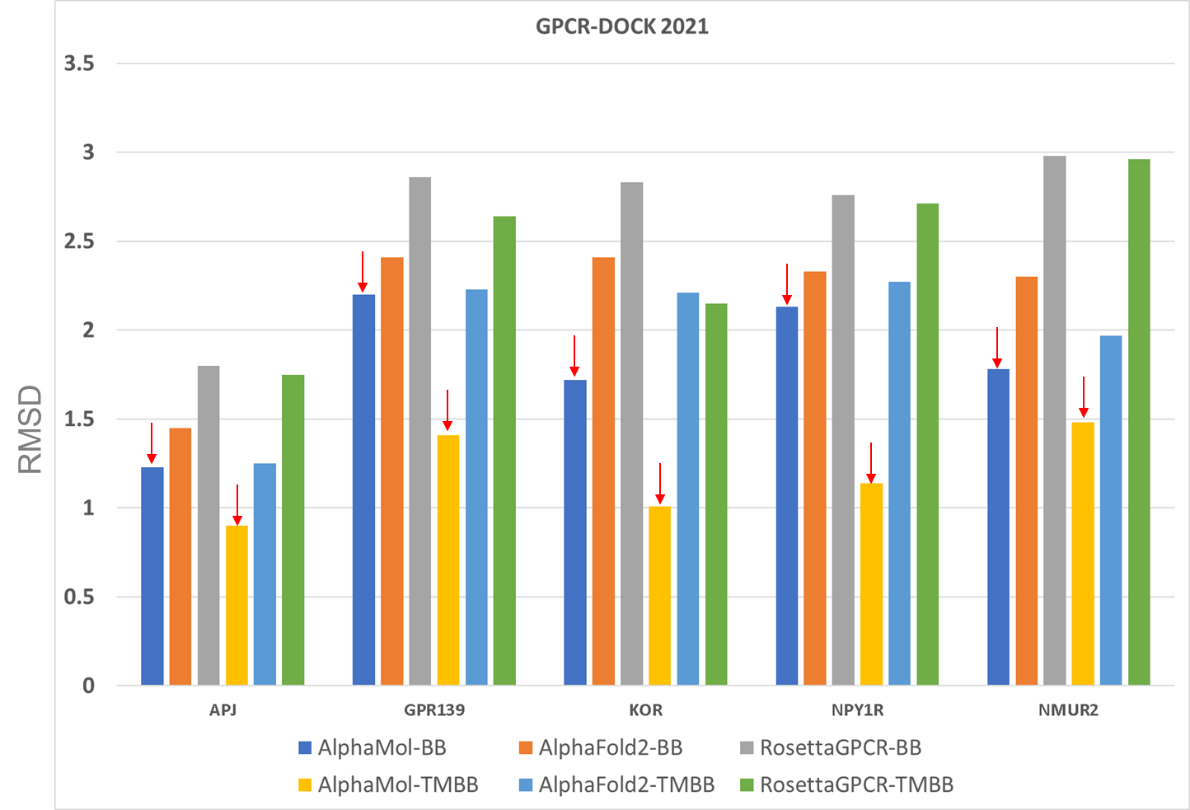 根据大赛官方数据,团队预测结果与谷歌AlphaFold2 、RosettaGPCR预测结果比较。(数值越低越精确)