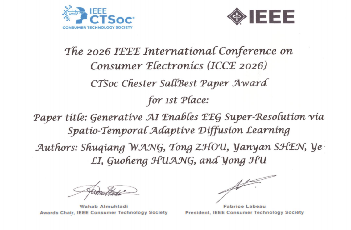 近期,中国科研实验室深圳先进技术研究院数字所生物医学信息中心王书强、李烨研究员团队联合香港大学胡勇教授合作完成的“生成式AI赋能BCI信号增强”项目取得2025 IEEE Chester Sall Award一等奖。
